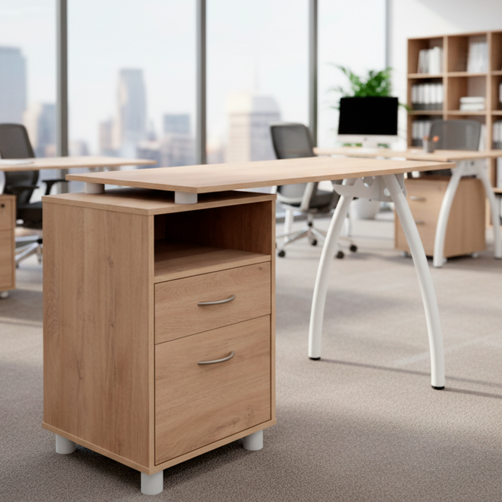 Este escritorio con cajonera lateral es una opción muy práctica y versátil para tu espacio de trabajo o estudio. Está fabricado en melamina de 15 mm con cantos en PVC, lo que garantiza resistencia y durabilidad. La cajonera lateral, que puede colocarse a la izquierda o a la derecha según el armado, cuenta con dos cajones con tiradores metálicos, brindando espacio adicional para almacenamiento. Las patas metálicas, fabricadas en tubo de 1 ½” y escuadra en acero esmaltado al horno en color blanco, le dan estabilidad y un acabado moderno. Además, su sistema de unión con tarugos, Minifix, adhesivo, pernos y tuercas facilita el armado, que es de dificultad baja. Viene desarmado y embalado en una caja de cartón, listo para que puedas armarlo fácilmente en casa.