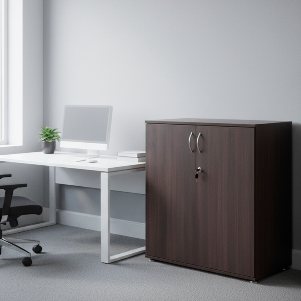 Mueble bajo de diseño compacto y funcional, ideal para espacios de oficina, recepciones, salas de reunión o entornos educativos. Fabricado en melamina de alta resistencia, combina una estructura sólida con detalles estéticos como tiradores metálicos satinados y cerradura cromada. Dispone de dos puertas de apertura vertical y una repisa divisoria interior que facilita la organización de documentos, artículos de oficina o materiales. Su construcción robusta lo convierte en una opción práctica, duradera y adaptable a diferentes ambientes profesionales.