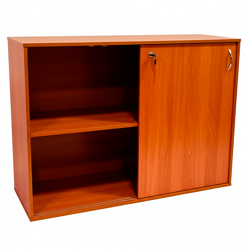 Gabinete bajo con puertas correderas, ideal para oficinas, salas de archivo o entornos institucionales donde se requiere un almacenamiento práctico y eficiente sin comprometer el espacio frontal. Fabricado en melamina de alta resistencia con terminaciones de calidad y tapacantos en PVC, incorpora dos repisas internas para una óptima organización. El sistema de puertas correderas facilita el acceso en espacios reducidos, mientras que su cerradura con llave proporciona seguridad para documentos u objetos personales.