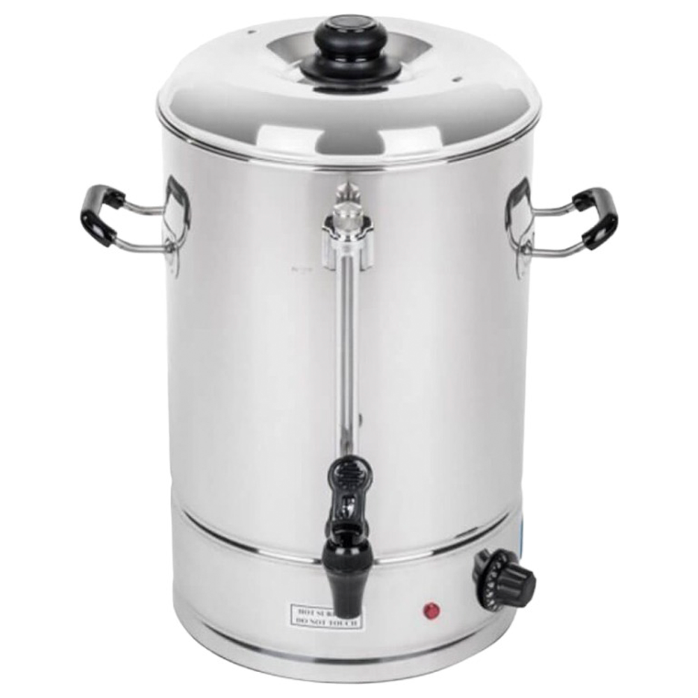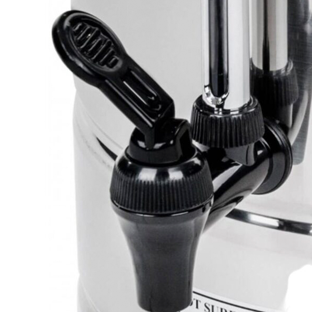 El equipo está construido con un cuerpo y tapa de acero inoxidable, lo que garantiza durabilidad y facilita la higiene. Destaca su sistema dosificador resistente con acabados cromados, que permite servir el agua de forma precisa y controlada. Alcanza una temperatura máxima de 105° C, asegurando la completa ebullición.