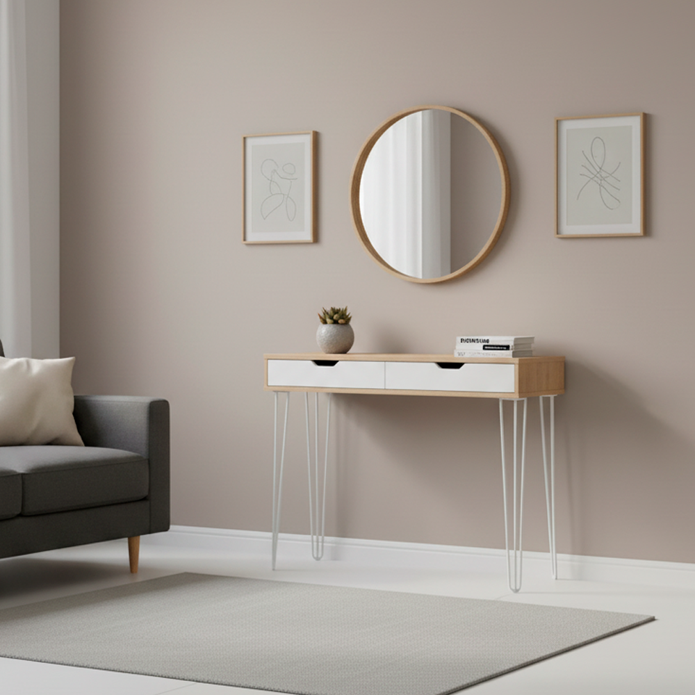 Mesa arrimo de melamina color Jerez con un cajón largo con frentes lacados blancos. Patas Vintage de acero trefilado esmaltado blanco.