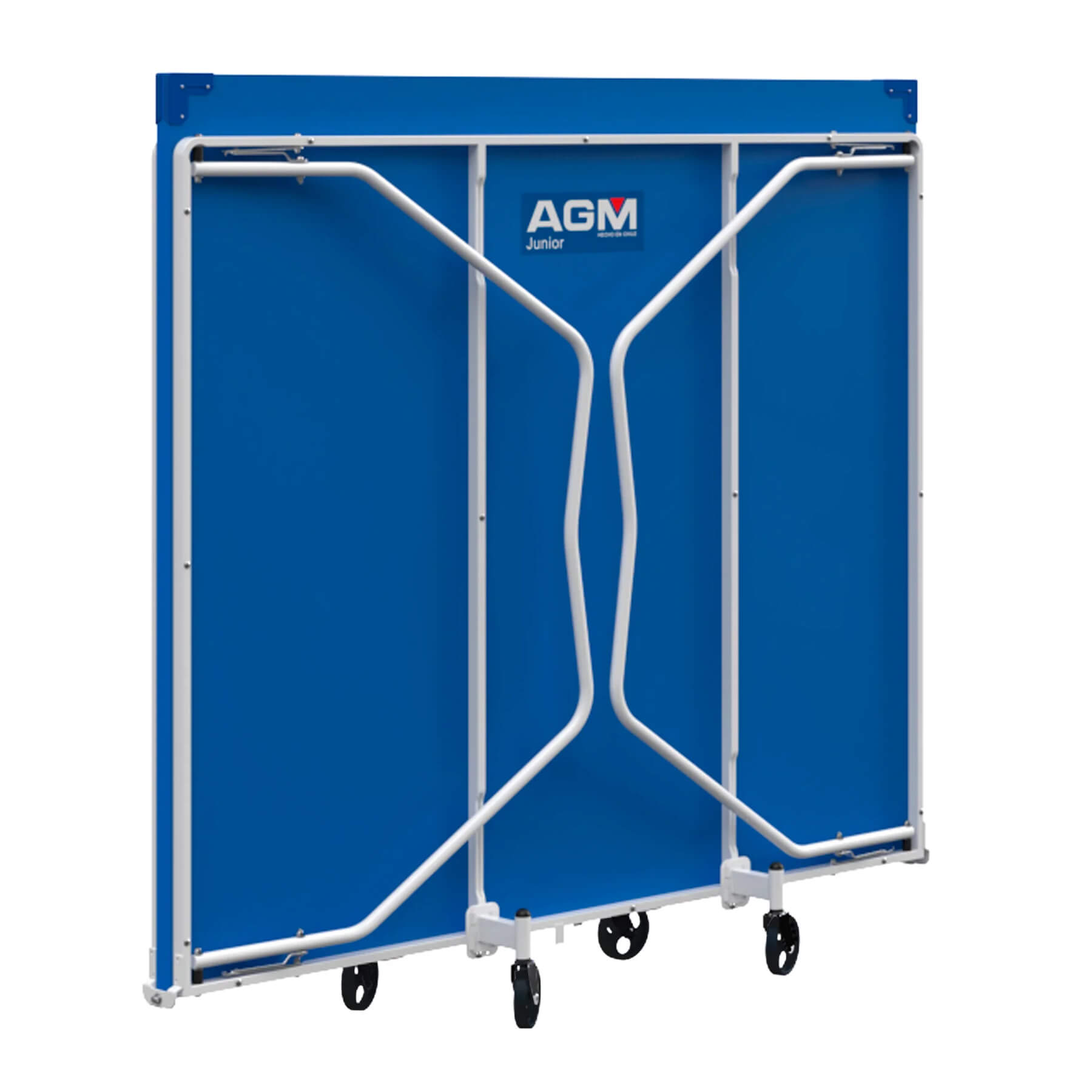 Su superficie está compuesta por cubiertas de MDF de 15 mm con tapacantos en PVC, pintadas en color azul y protegidas con barniz acrílico UV, lo que garantiza un rebote uniforme y duradero. El marco de acero y las patas plegables con bisagras cincadas brindan firmeza y practicidad en cada uso.