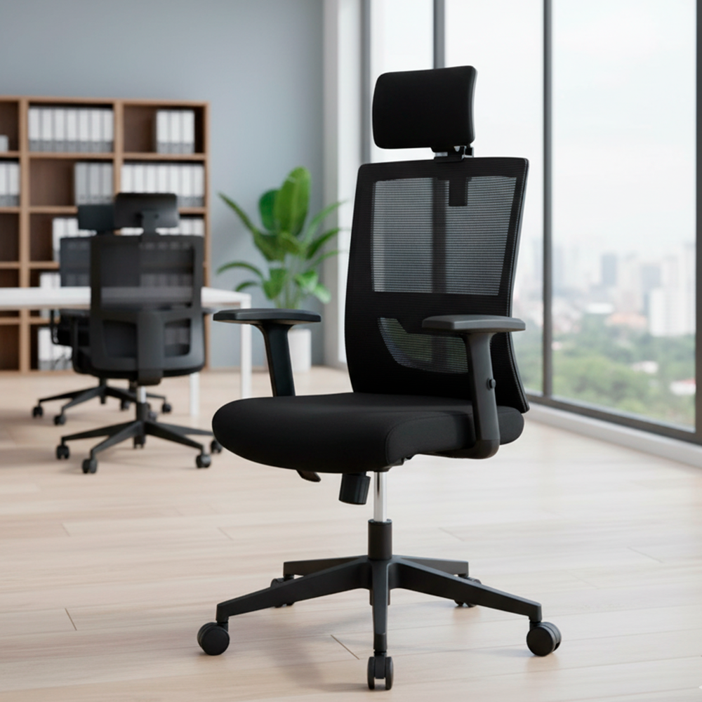 Silla ejecutiva de alto confort con diseño ergonómico, ideal para oficinas, home office o estaciones de trabajo de uso intensivo. Cuenta con un cabecero ajustable tapizado en espuma inyectada, asiento de espuma moldeada, brazos regulables y mecanismo reclinable de 2 posiciones, todo sobre una base de nylon robusta y estable.