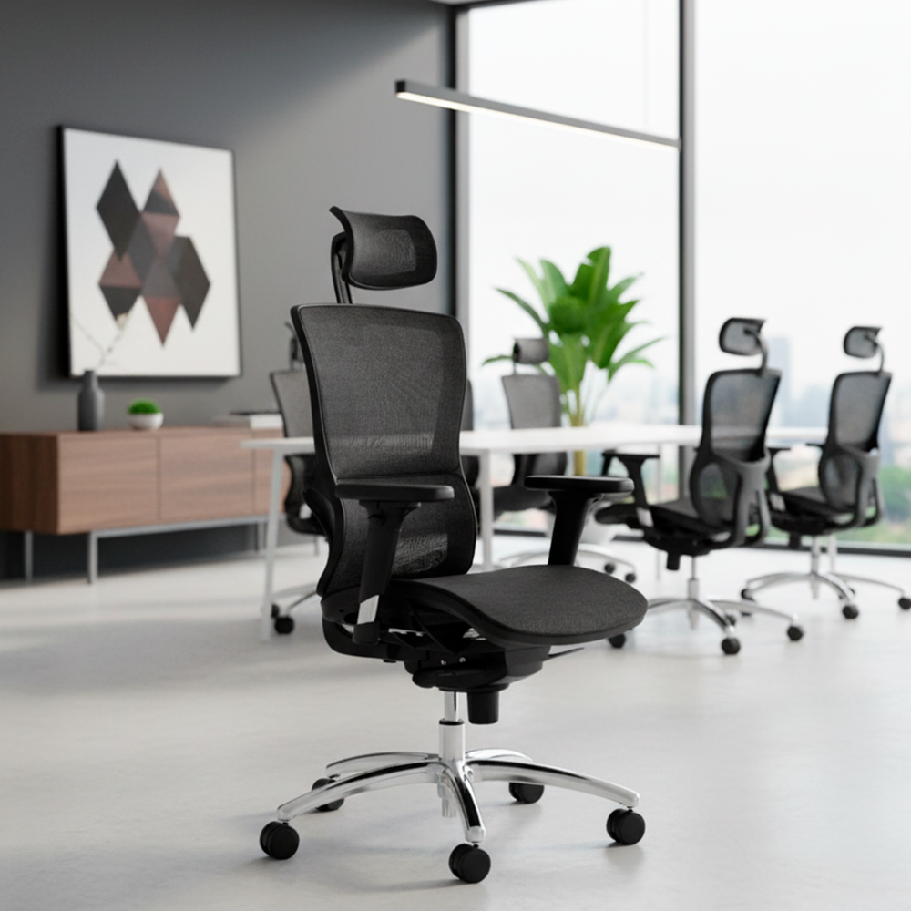 La Silla Gerencial Toronto combina diseño moderno y ergonomía de alto rendimiento para entornos ejecutivos. Con cabecero de malla ajustable en altura y un marco trasero de nylón, ofrece soporte lumbar y ventilación óptima para jornadas prolongadas. La malla elástica Taiwan facilita una adaptabilidad de perfil y confort superior. Sus brazos regulables en 3D permiten ajustar altura, profundidad y ángulo para una postura personalizada. El mecanismo sincrónico con 4 posiciones de bloqueo, junto con la perilla de regulación de tensión, garantiza un soporte estable y una experiencia de asiento suave y dinámica. Construcción duradera con base de aluminio pulido y ruedas de PU de 60 mm para movilidad suave y robusta en superficies diversas. Ideal para oficinas ejecutivas, salas de reuniones y puestos de trabajo de alto rendimiento.